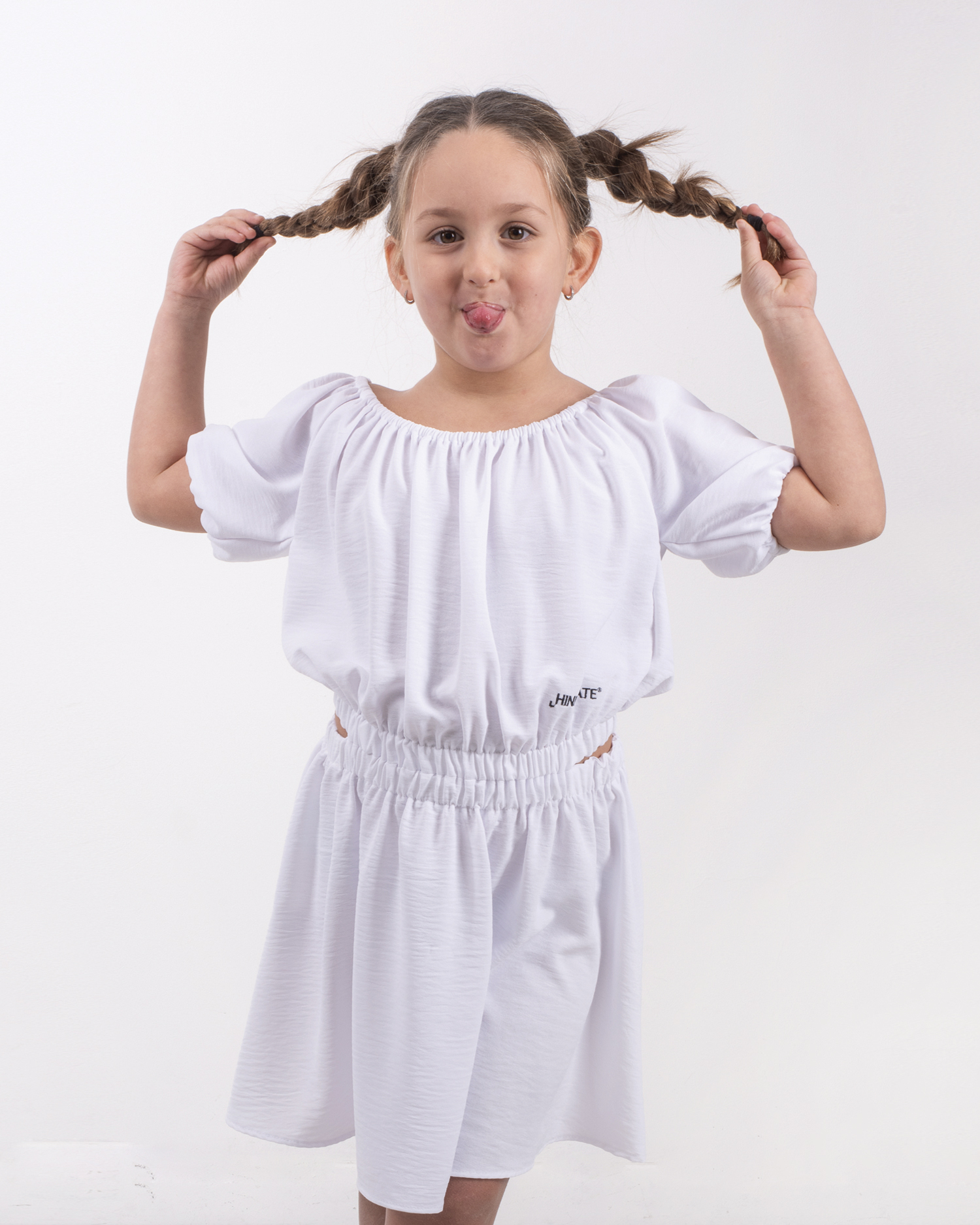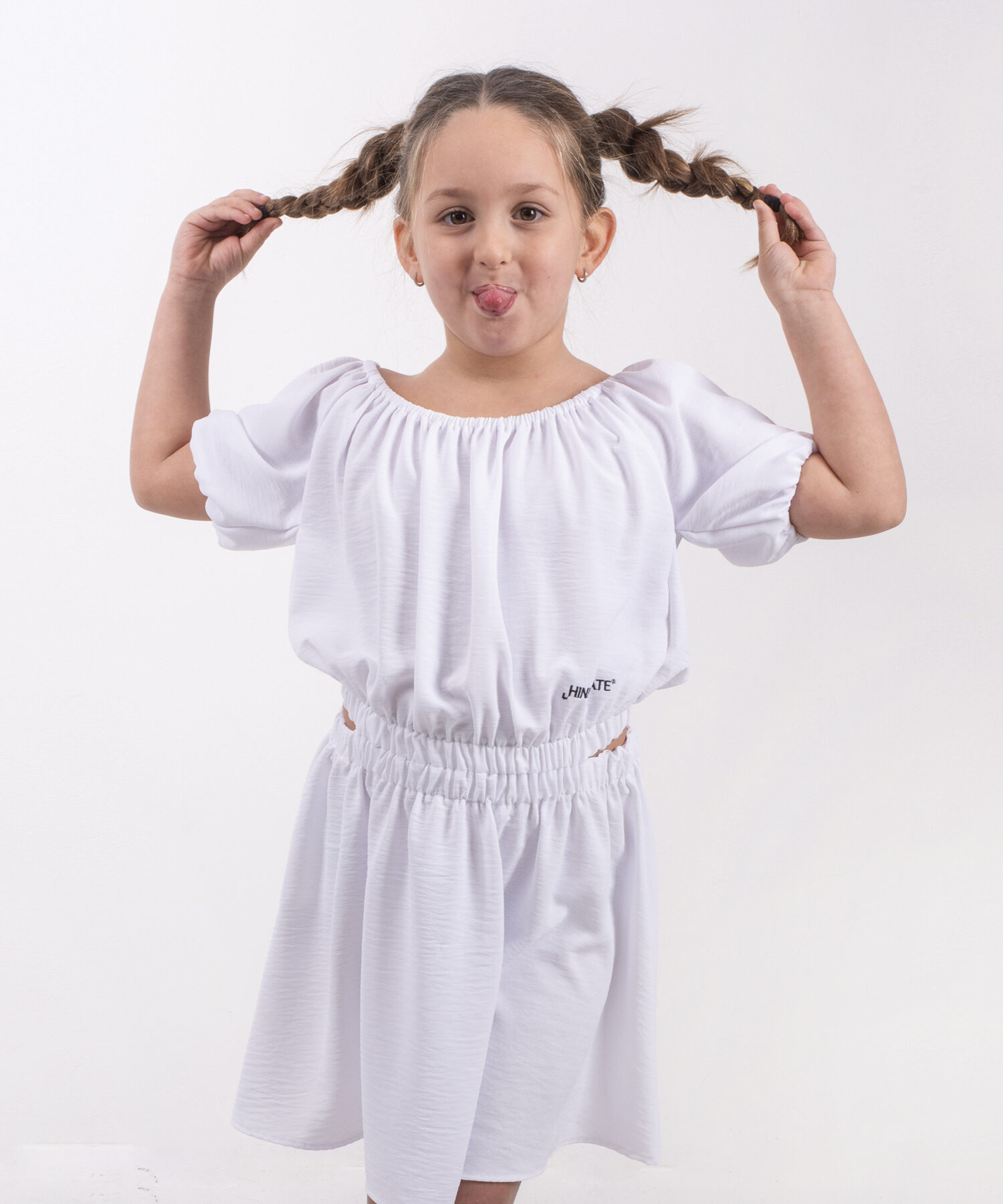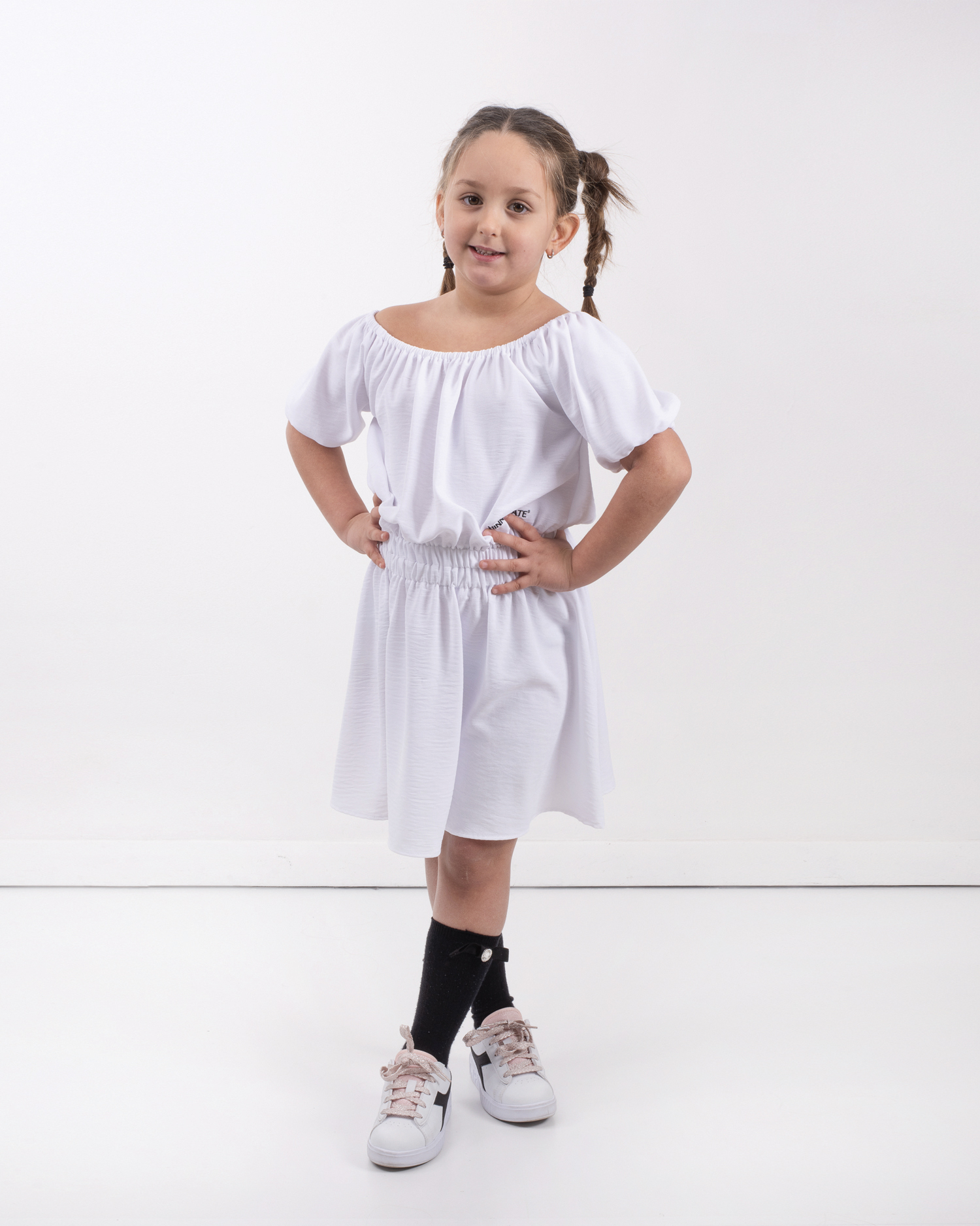 ABITINO MINI GONNA A RUOTA, SCOLLO A BARCA CON ELASTICO E MANICHE A PALLONCINO, DOPPIO CINTO STACCATO IN VITA, TESSUTO EFFETTO LEGGERMENTE GOFFRATO