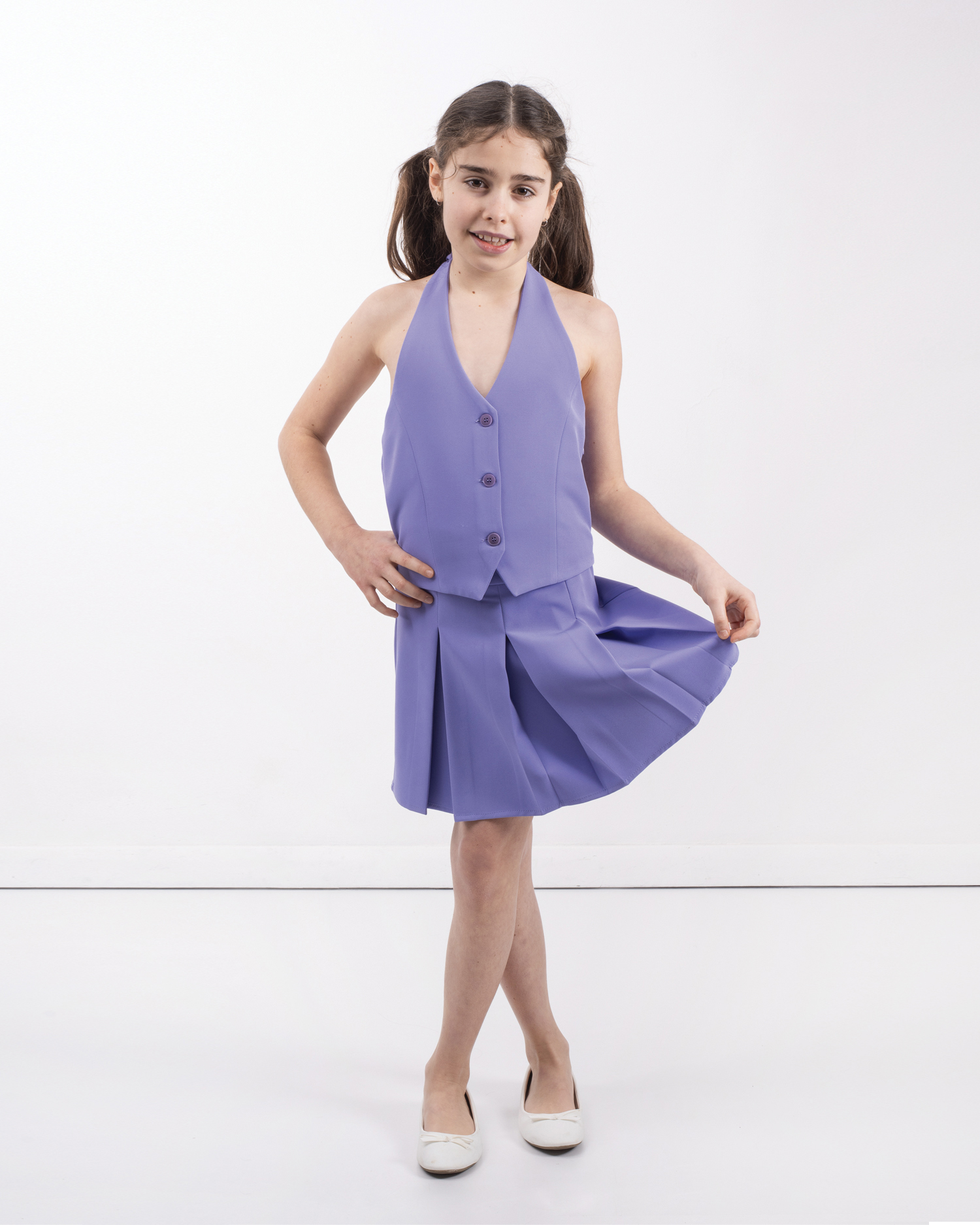ABITO, SCOLLO ALL’AMERICANA, EFFETTO GILET CON CHIUSURA TRE BOTTONI E GONNA A PIEGHE
