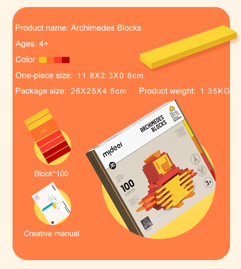 Ti presentiamo Mideer Archimedes Blocks, il giocattolo perfetto bambini intraprendenti! I blocchi Mideer sono progettati per aiutare il bambino a sviluppare la propria creatività e capacità di risoluzione dei problemi. Con una fantastica tavolozza di colori, questi blocchi intratterranno sicuramente il bambino per ore. Sono realizzati con materiali di alta qualità e sono sicuri per i bambini di dai 3 anni di età. Inoltre, sono facili da pulire e riporre. Una perfetta idea regalo, il giocattolo perfetto fa viaggiare con l’immaginazione!I blocchi sono realizzati in legno, hanno una superficie smussata senza spigoli vivi in modo che il bambino non si faccia male.I bambini potranno costruire barche, case, elicotteri, castelli e qualsiasi cosa suggerisca loro la fantasia! Impareranno a costruire, provando a creare forme sempre nuove!Con i blocchi in legno Mideer i bambini potranno esercitare la loro immaginazione, imparare a riconoscere le forme e migliorare la loro coordinazione occhio-mano.La scatola contiene 100 blocchi di diversi colori e un manuale dal quale prendere ispirazione per le vostre creazioni.