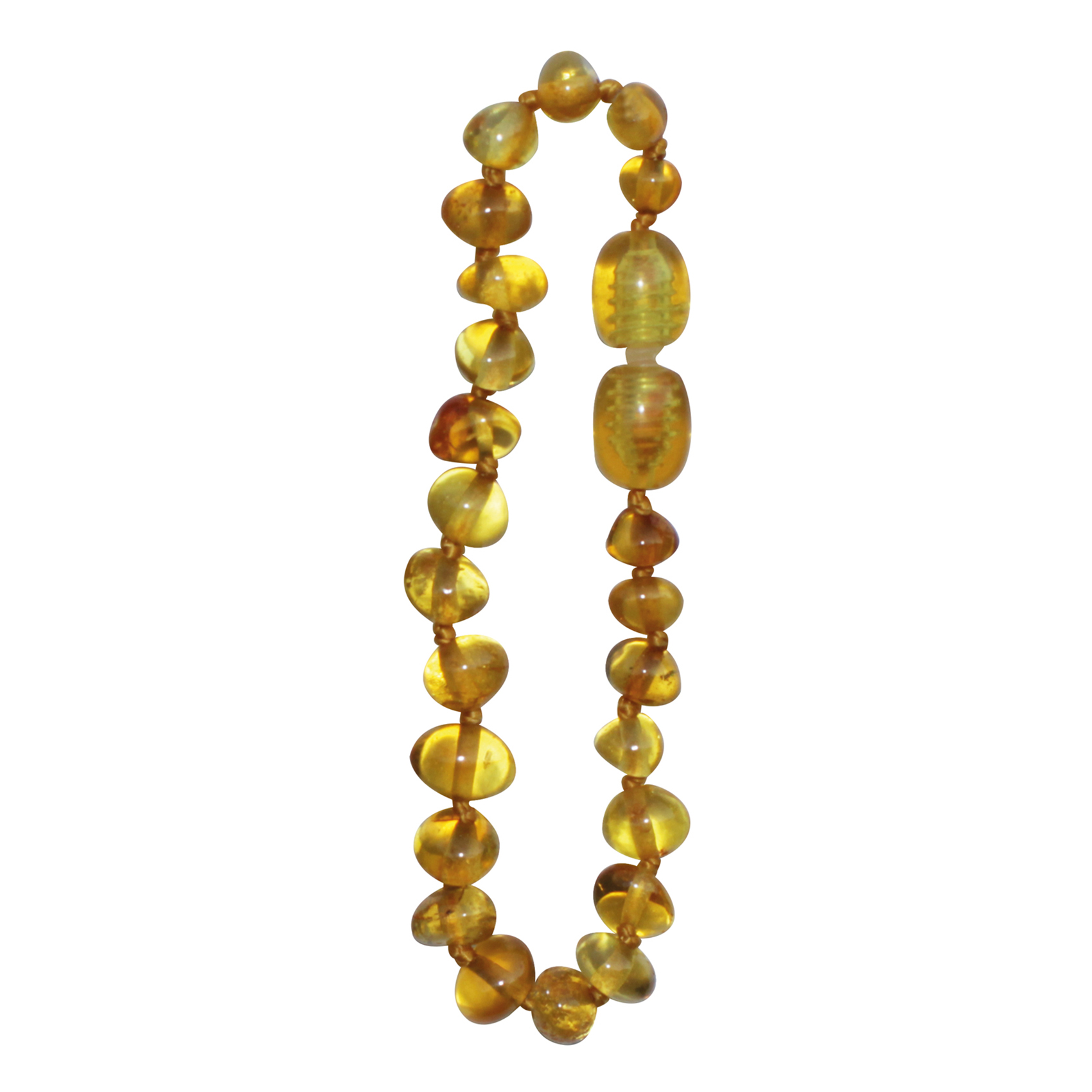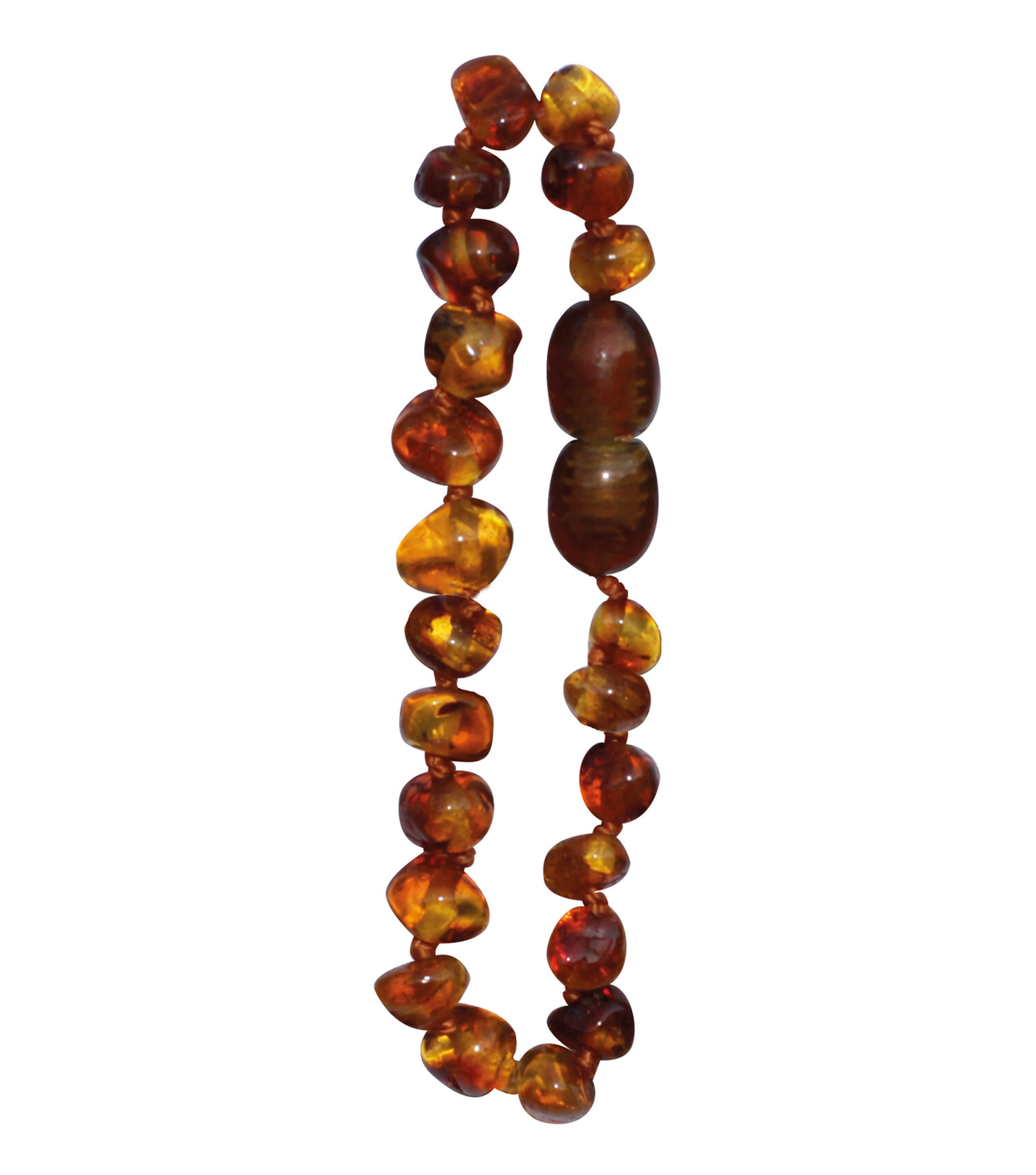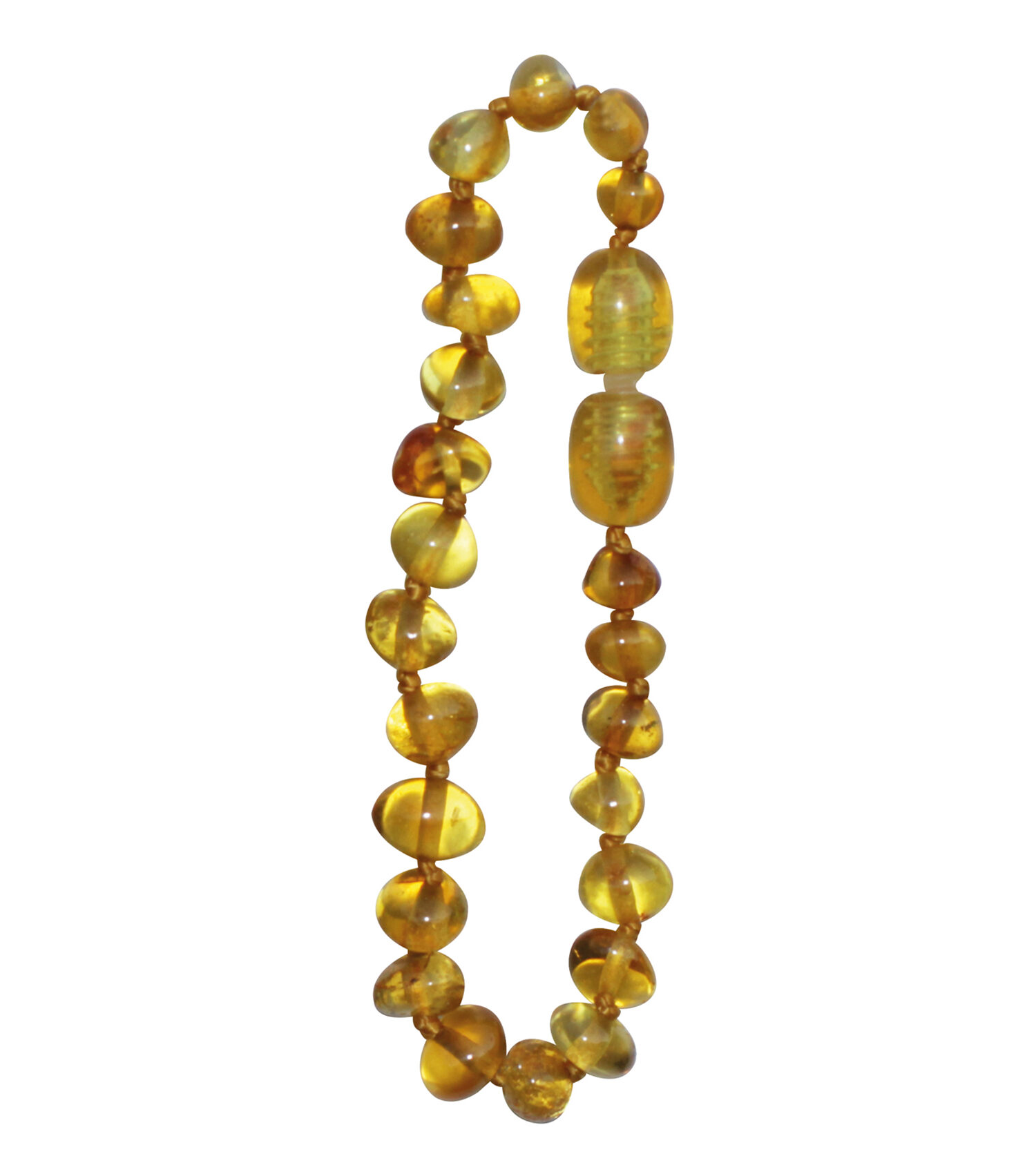 Ambra: l’oro del Baltico.L’ambra baltica è una resina fossile molto pregiata. Utilizzata sin dai tempi più remoti per creare raffinati monili e come moneta di scambio. All’ambra sono attribuite importanti virtù curative: a contatto con la pelle secerne infatti piccolissime quantità di acido succinico, la cui concentrazione varia dal 3 all’8%, che agisce come biostimolante, migliorando e proteggendo lo stato di salute generale di chi la indossa. Per beneficiare degli effetti positivi dell’ambra, la collana deve essere sempre indossata a contatto con la pelle.Azione antinfiammatoria e analgesica naturale: perfetta per i dolori da dentizione!Il bracciale per bambini Anima Baltica svolge un effetto calmante sui dolori provocati dalla dentizione: l’acido succinico contenuto nell’ambra agisce sulle ghiandole salivari riducendo la salivazione e esercitando una funzione antinfiammatoria e analgesica naturale. Influisce positivamente sui dolori muscolo-scheletrici che possono accompagnare la crescita e rinforza il sistema respiratorio e l’apparato bronco-polmonare, alleviando i sintomi di raffreddore, asma, allergie e infiammazioni di varia origine e natura. Favorisce il relax e il buon sonno grazie al suo effetto calmante.Amica dell’ambiente e sicura per i bimbi!La linea Anima Baltica è 100% green: le collane e i bracciali non contengono parti metalliche. Ogni elemento è lavorato con effetto “baroque” che rende ogni singola pietra arrotondata. Le pietre sono intervallate da un nodo per evitare che in caso di rottura del filo possano sfilarsi ed essere ingerite dal bambino.Si consiglia di sciacquare i bracciali e le collane Anima Baltica sotto acqua corrente almeno una volta ogni tre giorni.