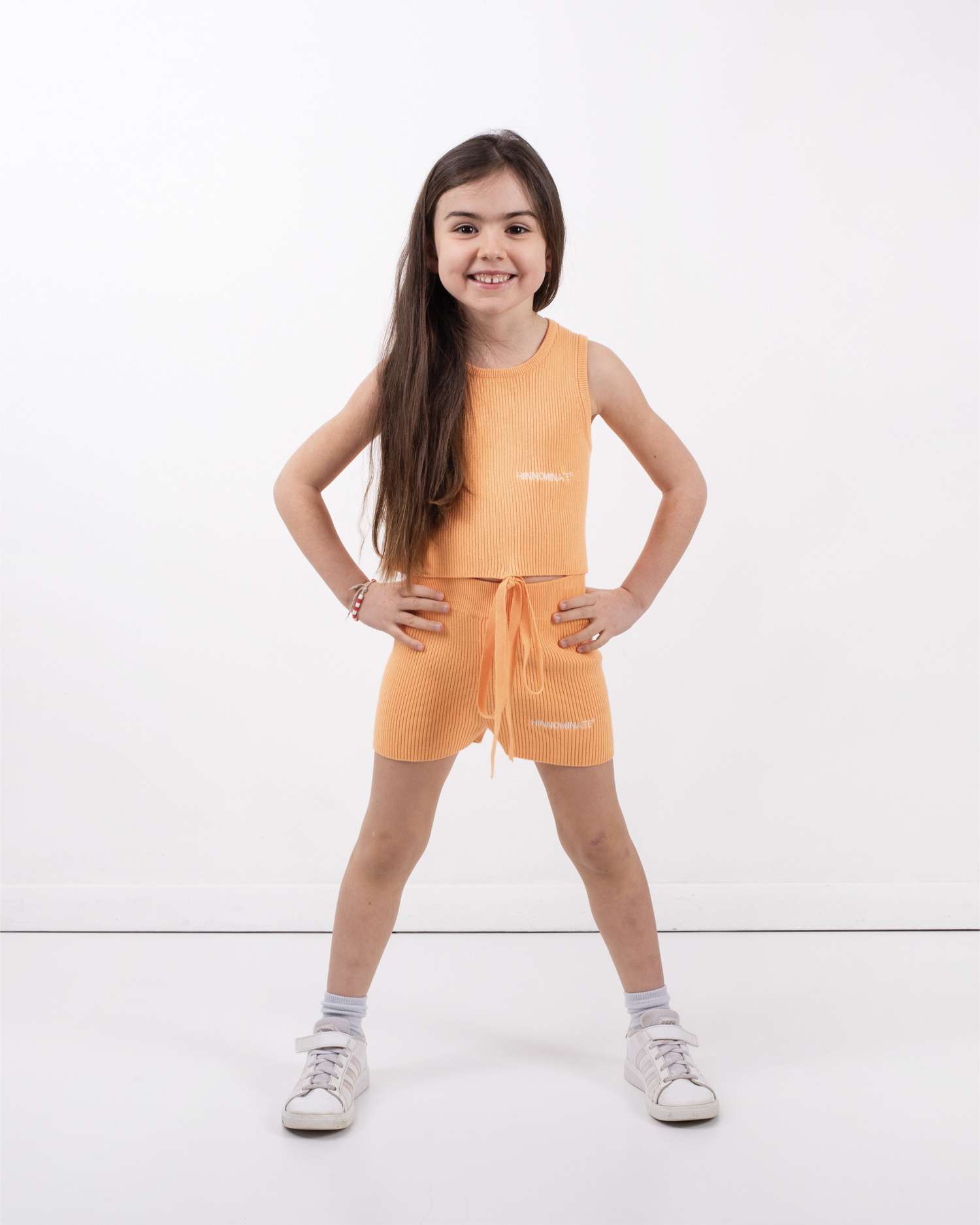 COMPLETO IN MAGLIA DI COTONE A COSTINE, CON TOP CROP SMANICATO, CON FIOCCO + SHORT CON LOGO RICAMATO