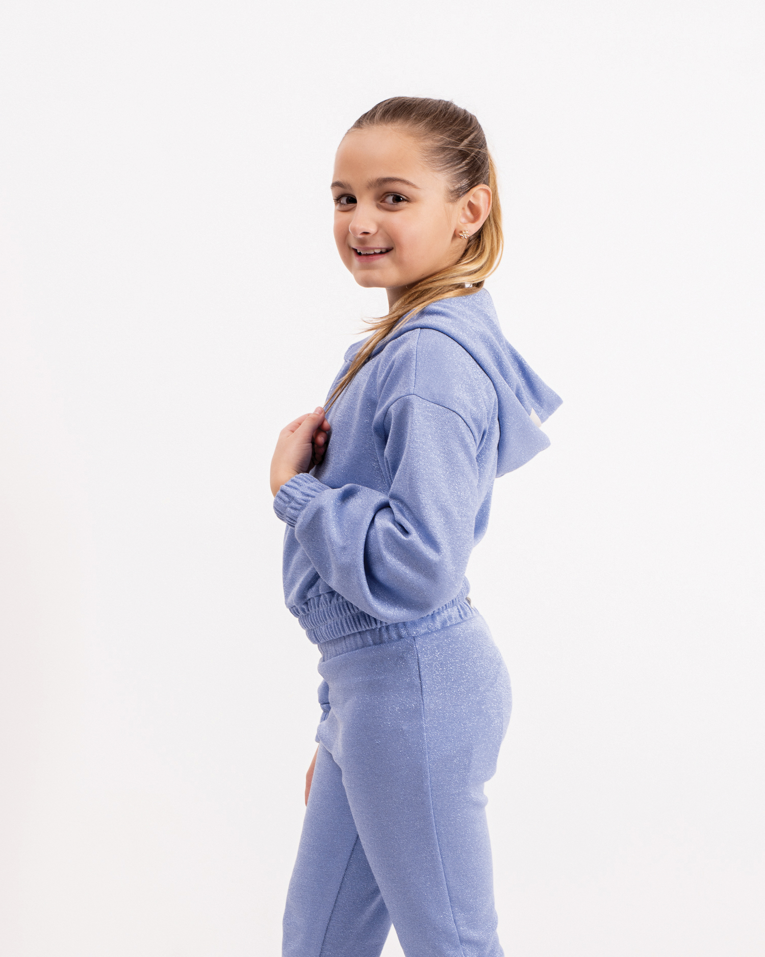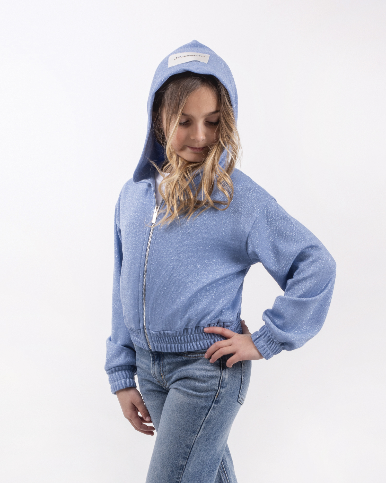 FELPA CON CAPPUCCIO ,ELASTICO IN VITA E POLSINI , CHIUSURA VERTICALE CON ZIP METALIICA IN MAGLIA LUREX