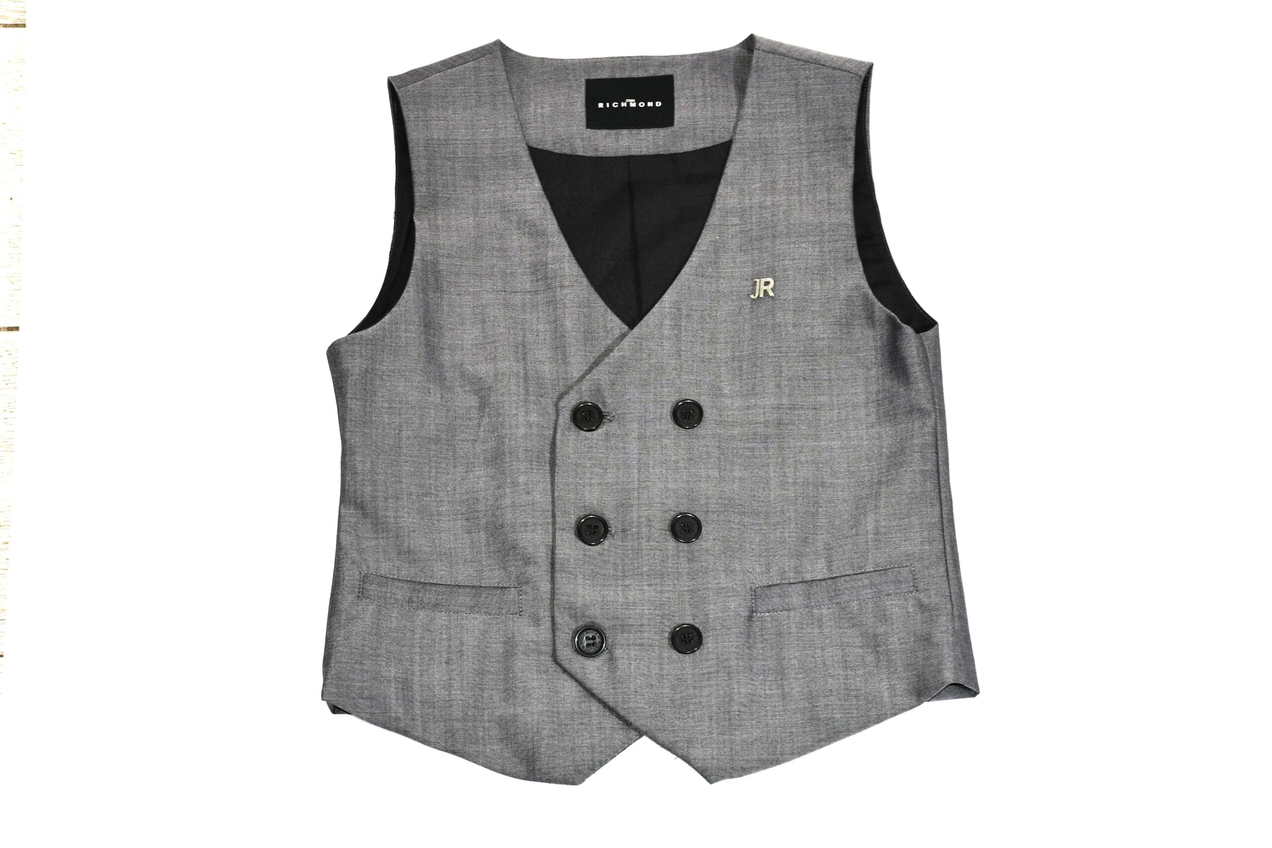 Gilet per bambino in colore Grey Dark, ideale per la stagione Primavera/Estate 25. Realizzato con un mix di materiali di alta qualità: 55% poliestere, 45% lana e fodera 100% cotone, offre comfort e stile per i più piccoli. Perfetto per un look elegante e versatile.