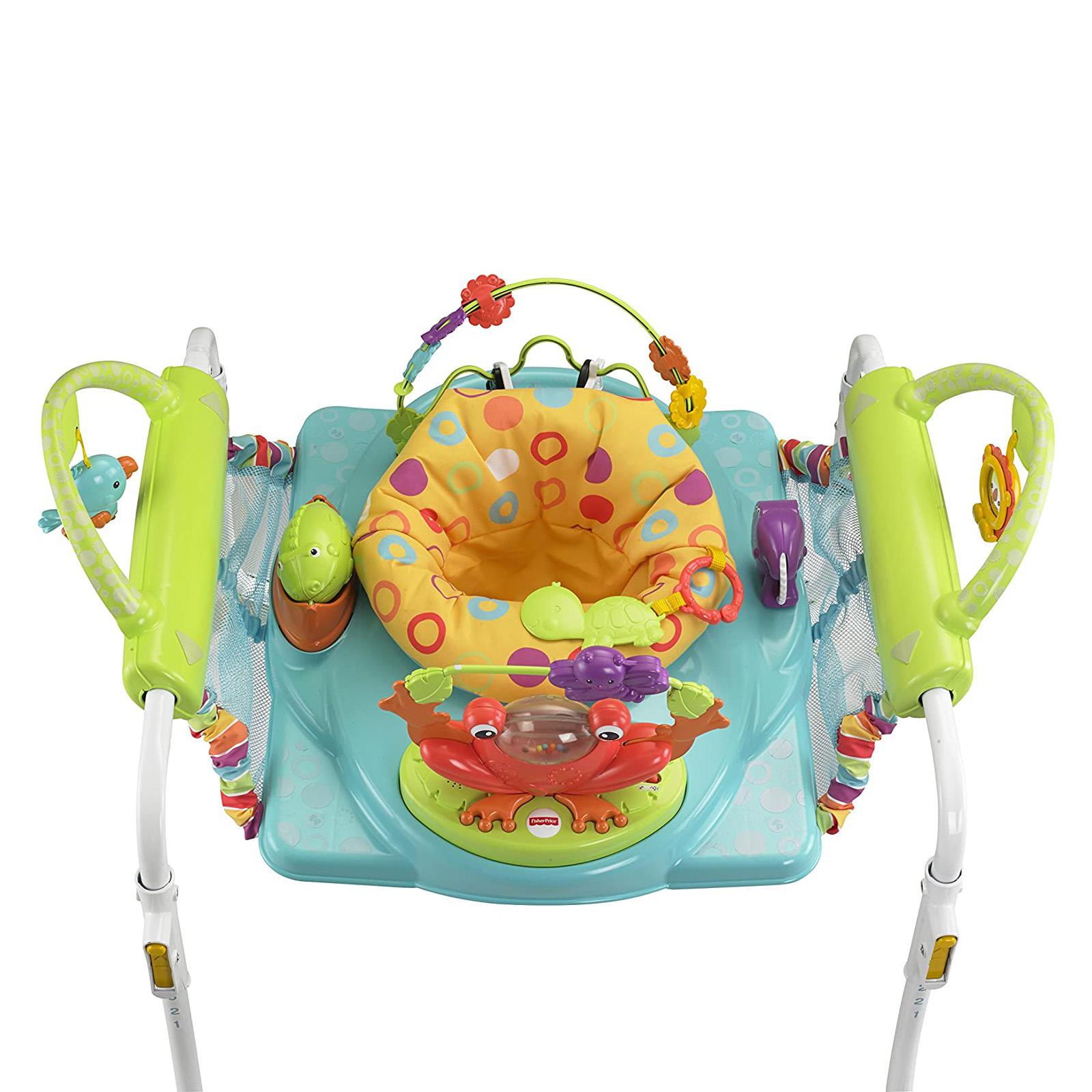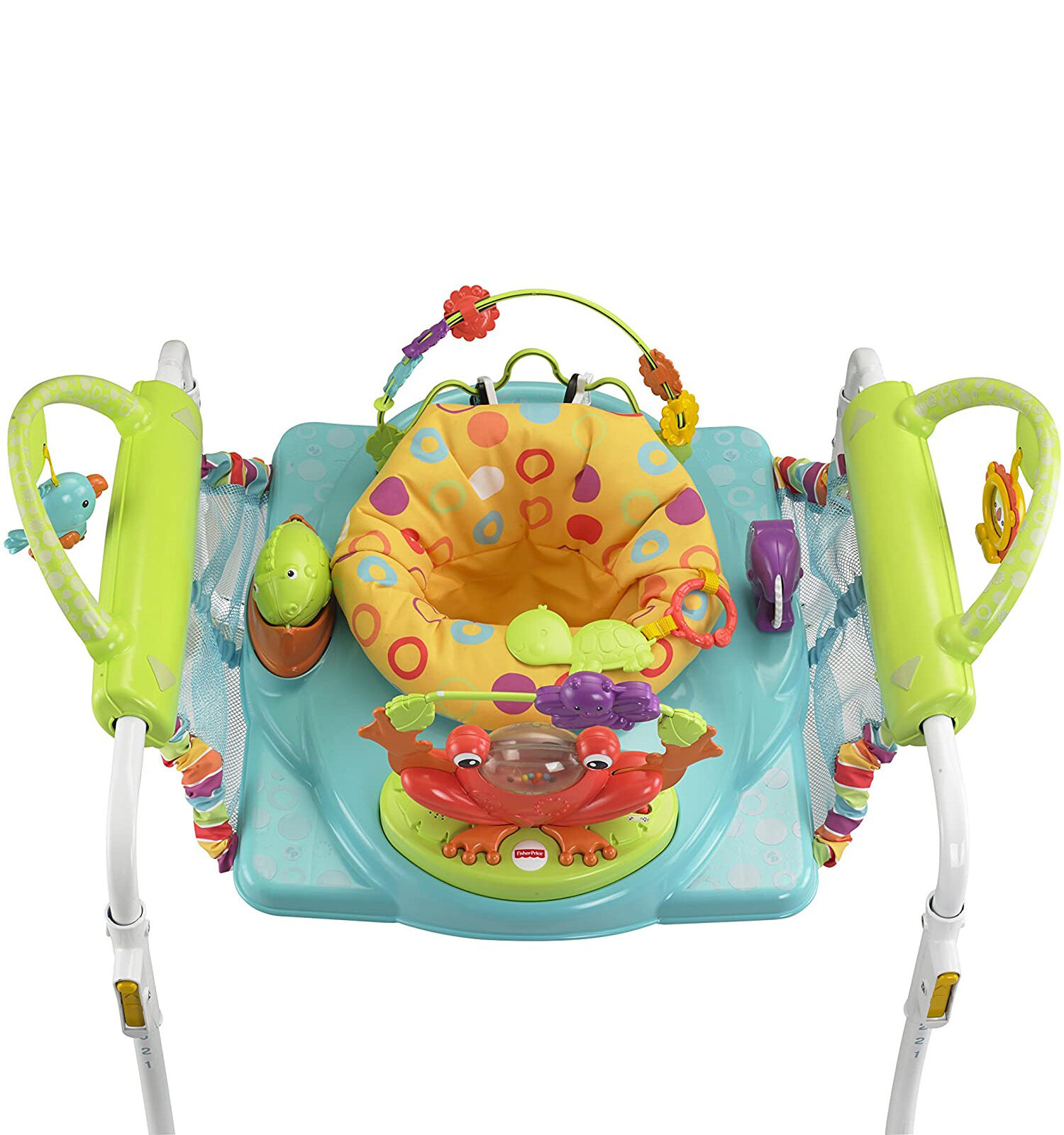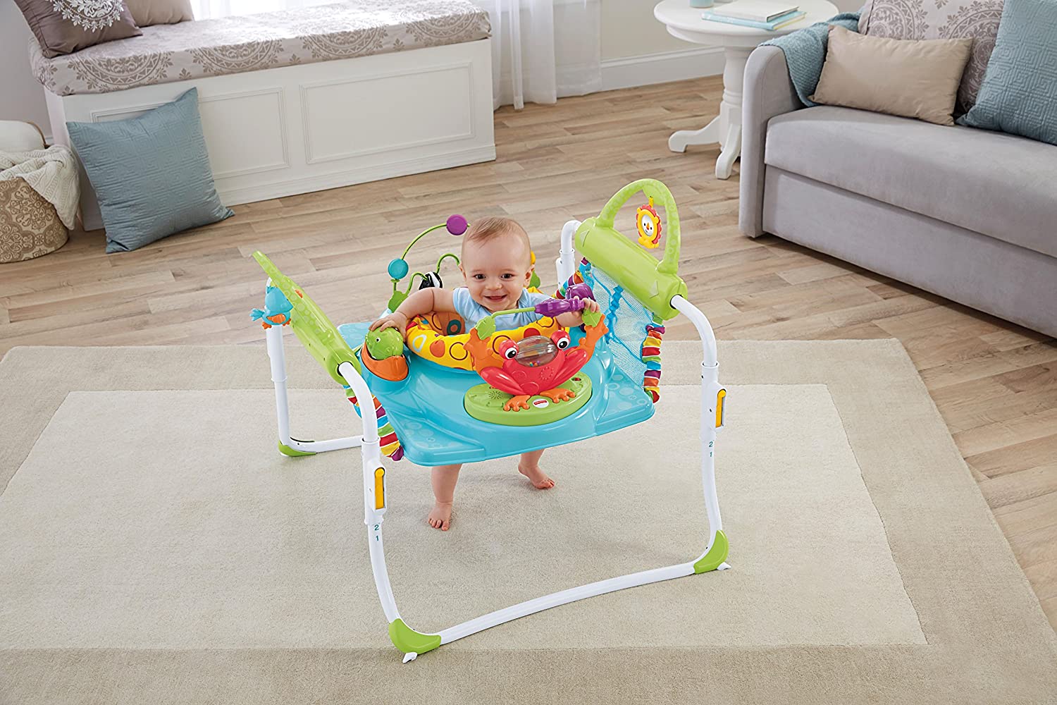 Con il Primi Passi Centro Attività il vostro piccolo potrà saltellare e compiere i suoi primi passi in tutta sicurezza! Il comodo seggiolino ruota a 360°, così il bambino può esplorare il centro attività raggiungendo tutti i giocattoli che lo circondano. Il telaio si allunga per aiutare il bambino a compiere i suoi primi passi! I coloratissimi giocattoli includono un uccellino, una barra con anelli, farfalla e tanto altro. Il rivestimento è lavabile in lavatrice e asciugabile a tamburo.