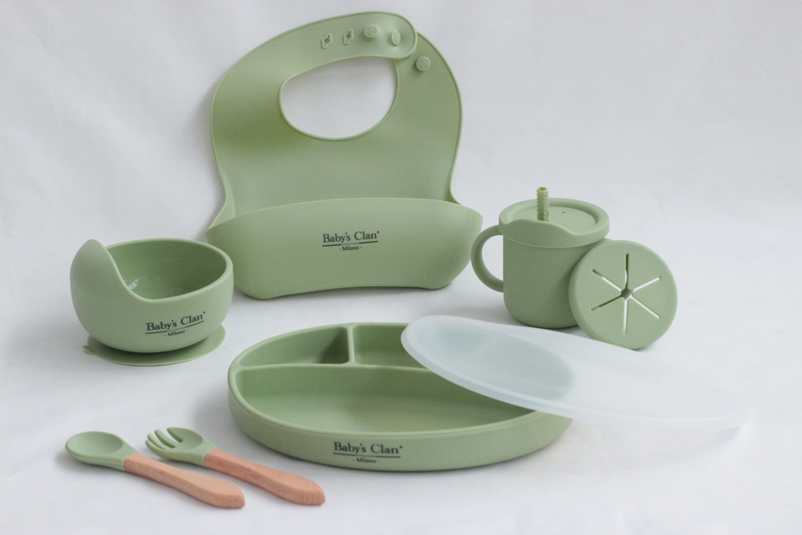 La pappa si fa più buona e più pratica con il set in silicone firmato Baby’s Clan.Con questo colorato set pappa in silicone alimentare BPA free composto da 9 pezzi, offrirete ai vostri clienti maggiore sicurezza e comodità, grazie alla ciotola e al piatto piano diviso in scomparti con ventosa sulla base e coperchio per riporre il piatto piano in frigorifero, al comodo bicchiere con cannuccia che, all’occorrenza diventa un pratico porta snack, alla bavaglia con la tasca per evitare che il cibo cada per terra o addosso al tuo bambino, forchetta e cucchiaio con manico in bamboo.Adatto a lavastoviglie e microonde, compatibile con gli sterilizzatori.Disponibile in 5 bellissimi colori:Azzurro polvere;Rosa scuro;Mango;Verde oliva;Grigio.Dimensioni: