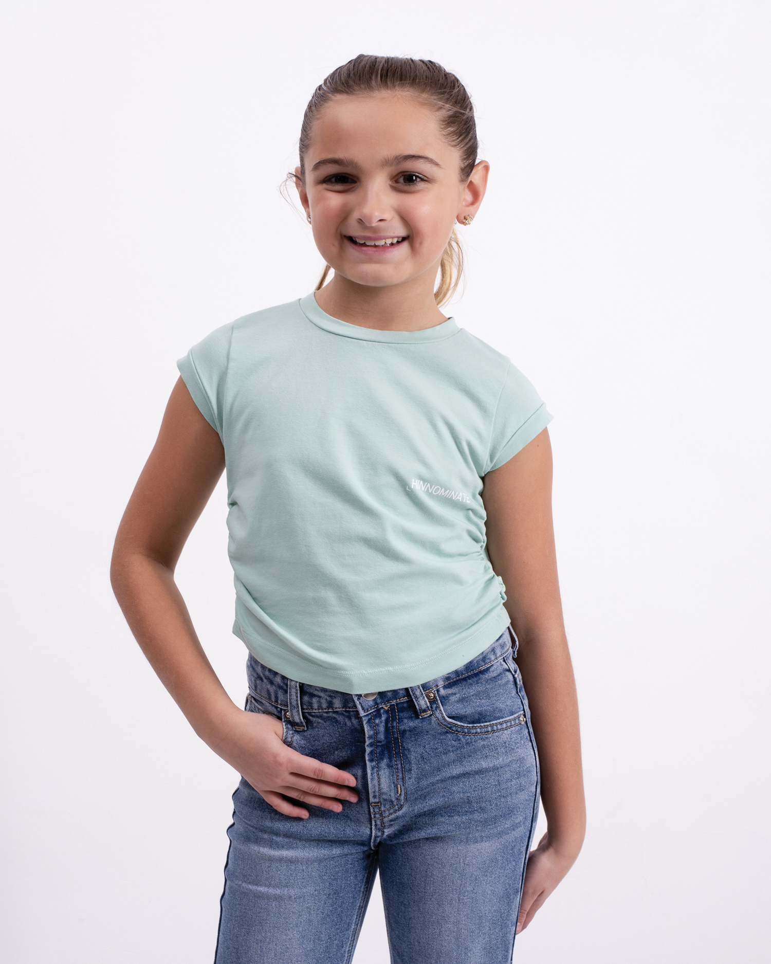TSHIRT GIRICOLLO, CROP, MANICA A FARFALLA , LOGO IN STAMPA ANTERIORE, CUCITURE LATERALI ARRICCIATE